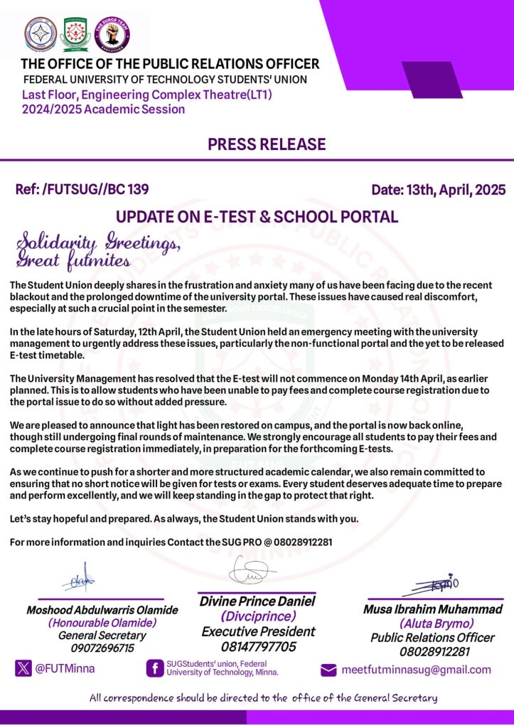 In a decisive move to address the growing concerns among students, the Students’ Union earlier today convened an emergency meeting with the Vice Chancellor of the Federal University of Technology, Minna. The meeting was prompted by widespread dissatisfaction over persistent disruptions in the academic calendar and issues affecting beneficiaries of the Nigeria Education Loan Fund […]